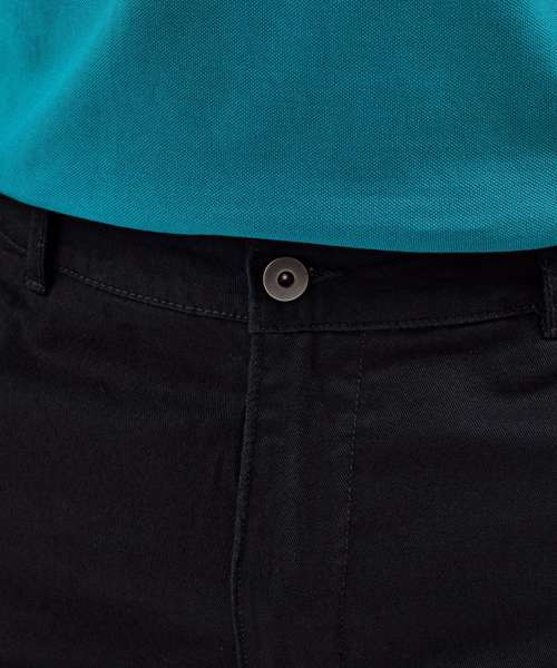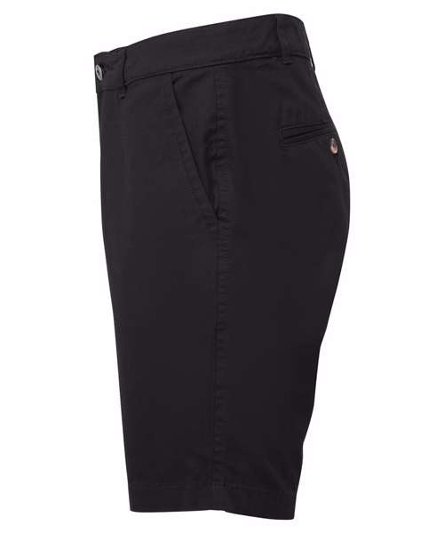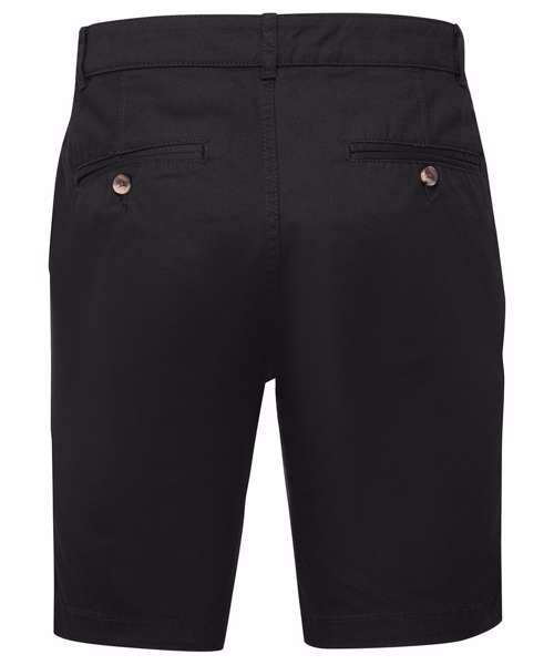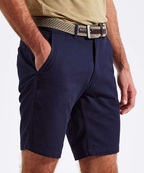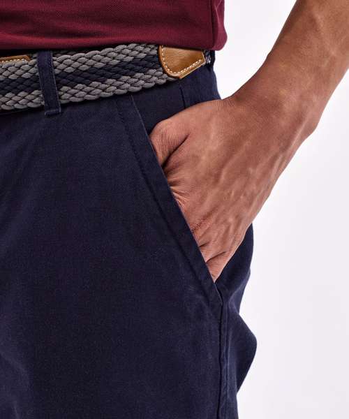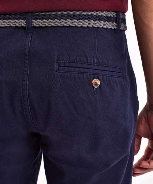 Men's chino shorts with two swings pockets and two back jet pockets with button fastening. Zip fly and button fastening to the front. Soft finish fabric. Product contains no branded neck label. Removable Kimble or looped garment tags. Inner seam label holds important product information on one label with a second label containing brand information which can be cut-away. Please note old stock may contain a fixed branded label.
