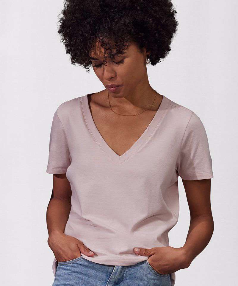 Classic modern fit #allpurpose. Side-seamed #fit. Feminine neck with enhanced V #femininesilhouette. Back neck tape for a clean finish #comfort. Forward shoulder seams #modern.