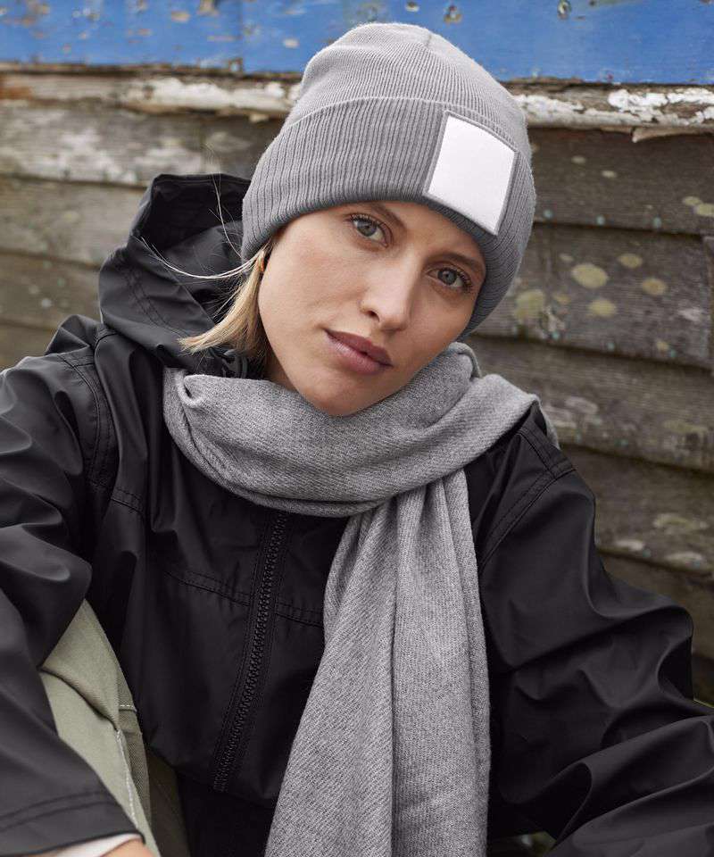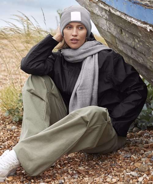 Contains 100% certified recycled material. Double layer knit. Cotton twill patch for decoration. Microfleece lining for comfort and warmth. TearAway label for ease of rebranding.