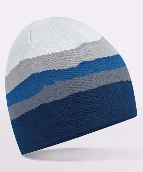 Contains 100% certified recycled polyester. Bold mountainscape design. Pull-on style. Double-layer knit. Recycled Polyester fleece band. TearAway label for ease of rebranding.