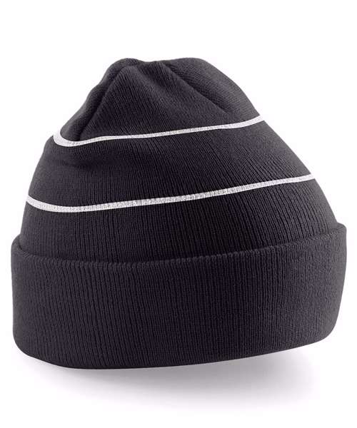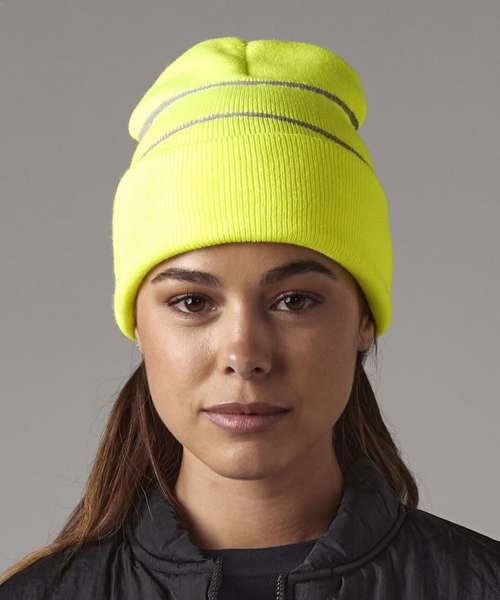 Enhanced-viz stripes. Double layer knit. Cuffed design for optimal decoration.