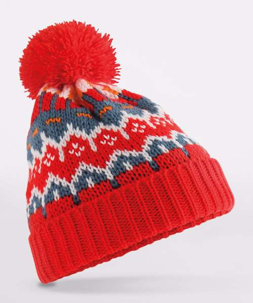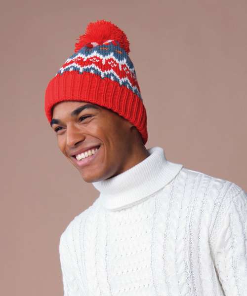 Full fleece recycled polyester lining. Timeless Fair Isle pattern. Classic styling. Self-coloured pom pom. Cuffed design for optimal decoration. TearAway label for easy rebranding.