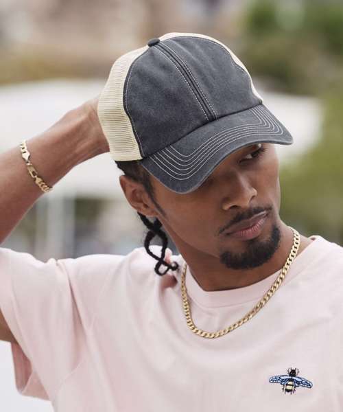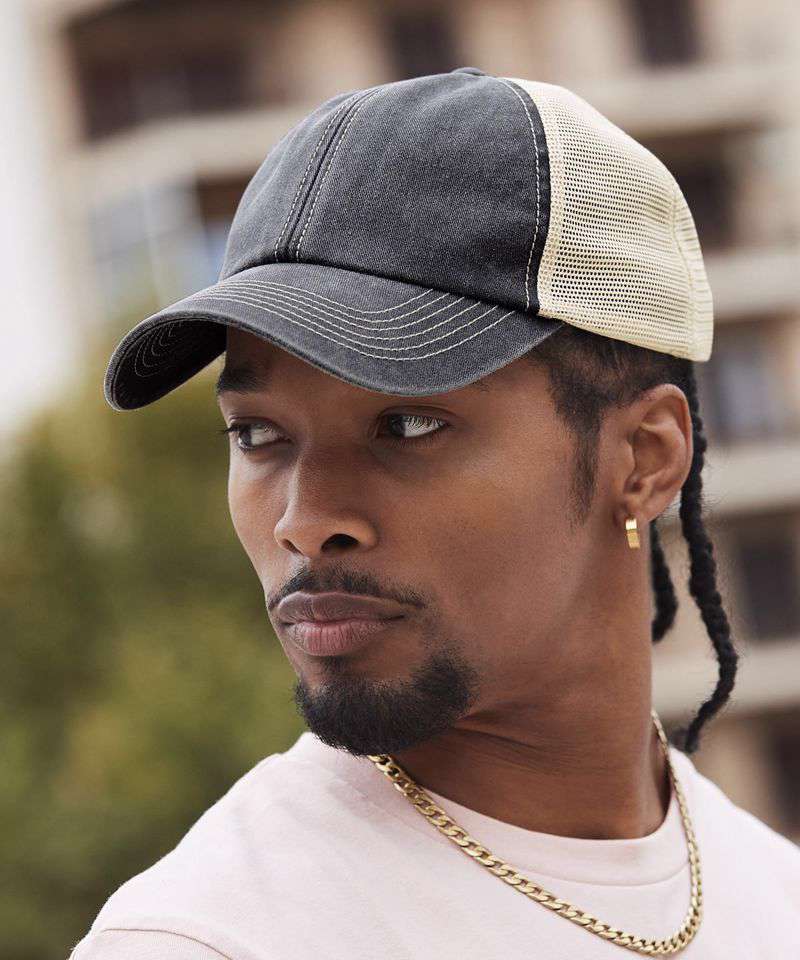 The 6-panel vintage trucker cap is edgy, with its hint of distressed retro styling. Made from heavy-washed cotton with recycled polyester mesh panels, it has a relaxed, unstructured crown and a curved peak for a classic look. Contrast stitching adds extra detail, while the snapback adjuster ensures a perfect fit. A timeless, laid-back piece with vintage appeal.