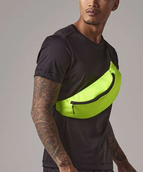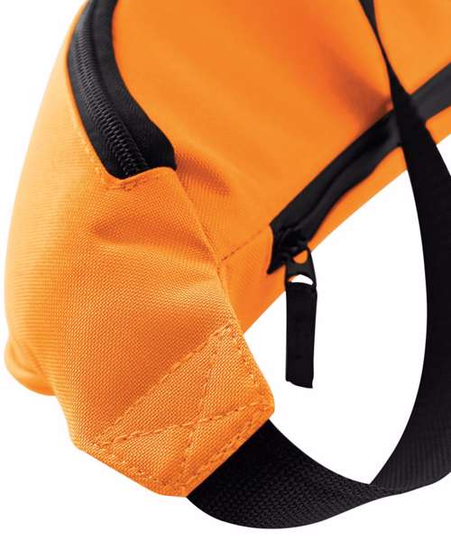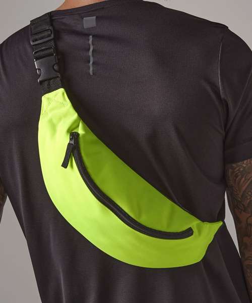 Adjustable webbing belt with secure clip fastener, large zippered main pocket, zippered rear pocket.