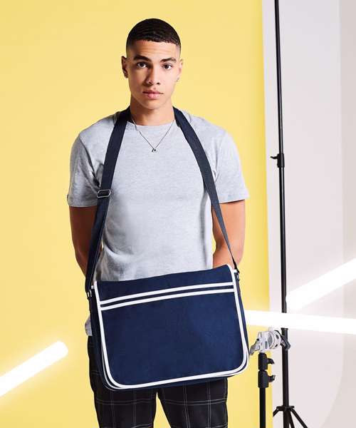 Retro styling. Adjustable shoulder strap. Zippered mesh pocket under flap. Rip-Strip™ closure. Contrast detailing. Reach certified.