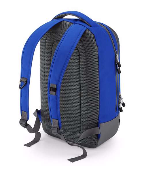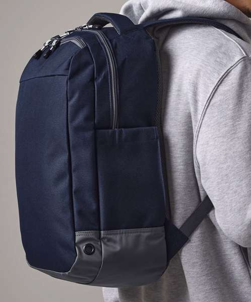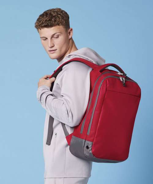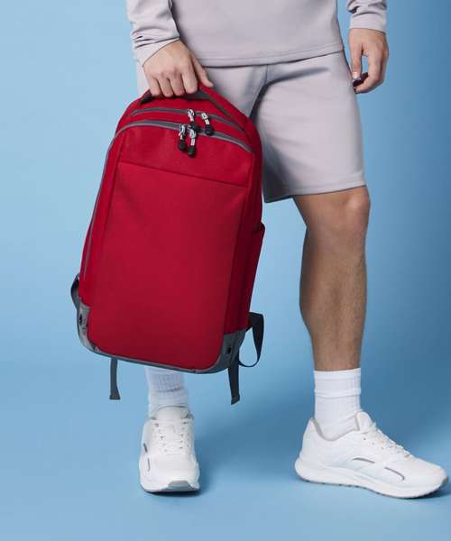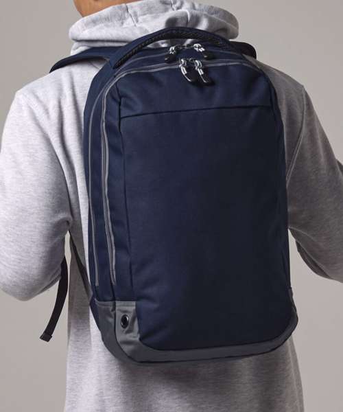 Water-resistant fabric. Wide zip opening for easy access. Front pocket organiser section. Internal slip pocket. External bottle pocket. Secure wireless headphone holder. Easy-access attachment clip. Metal ventilation eyelets. Breathable padded mesh back panel. Ergonomically designed straps for everyday comfort. Padded grab handle. TearAway label for ease of rebranding.