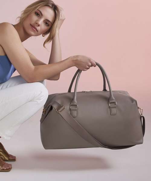 Saffiano fine grain. Extra-long main compartment zip for easy access. Zipped internal valuables pocket. Soft-touch lining. Internal baseboard. Protective base feet. High-shine gold metal zip. Self-fabric carry handles. Can be carried by hand or over the shoulder. Compatible with BG765 Boutique adjustable bag strap, Detachable, adjustable high-density webbing shoulder strap. TearAway label for ease of rebranding.