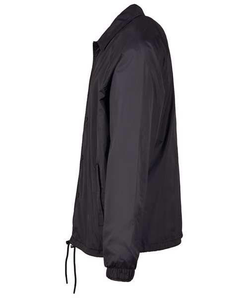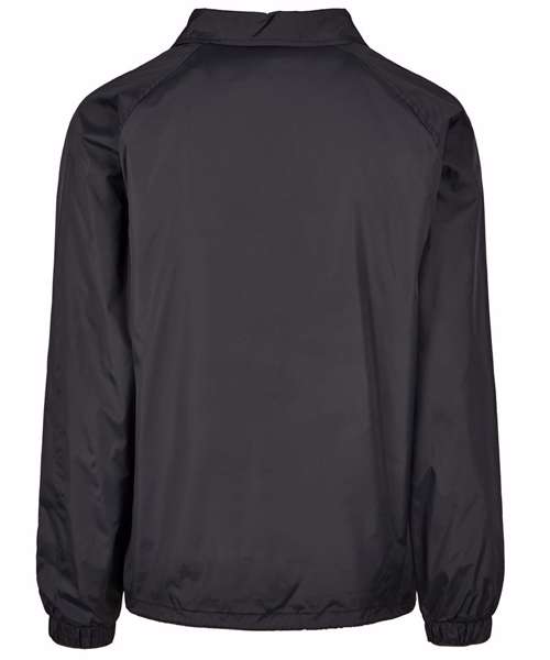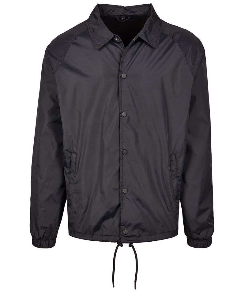 This sporty coach jacket pleases with a simple and functional design, which can be further enhanced through stitching, silk screening or flock printing. Its raglan cut with seamless shoulders in combination with the continuous press-button facing as well as the elastic cuffs turn this nice piece of garment into a real street wear style jacket. You will also get some handy side pockets and an elastic waistband with drawstring and stoppers at your disposal. The sophisticated design is rounded off by a simple yet elegant collar. The functional and robust upper is made of nylon, the lining out of cotton and taffeta.