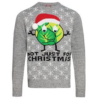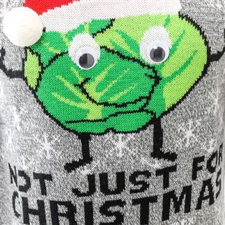 This is a brilliant novelty jumper for fans of the humble Brussel sprout. A bright and colourful cheeky sprout face with Santa hat with white pom-pom, with caption 'Not just for Christmas'. It's sure to be family favourite. .