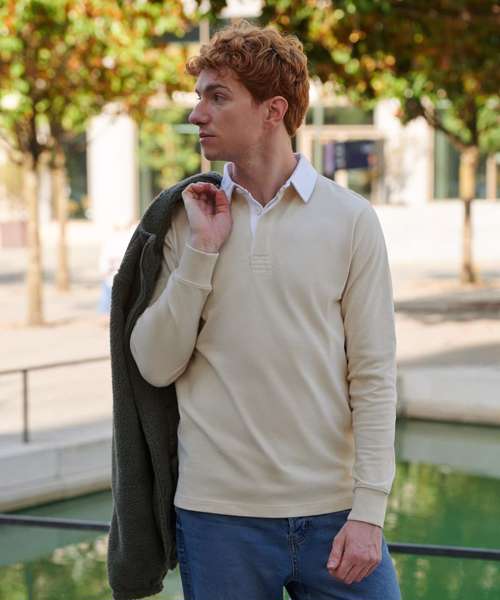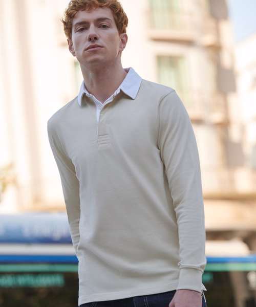 Slimmer fit rugby. Supersoft peached finish. Twin Needle Hems. Side vents with contrast tape detail. Contrast trim in back neck. Dyed to match buttons. Traditional Rugby Collar with cotton webbing. Unbranded: no back neck label. Size tab only with removable swing tag.