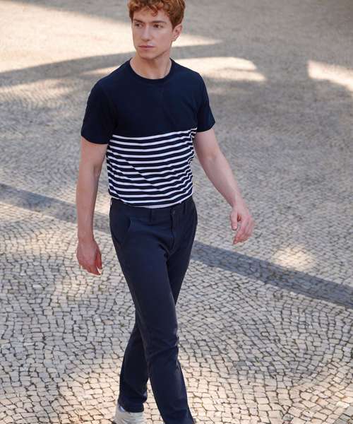 Flat front chino trouser. Tag free. Stretch fabric for ease of movement. Slanted front pockets, 2 back welt pockets, belt loops plain hem.