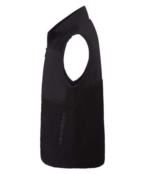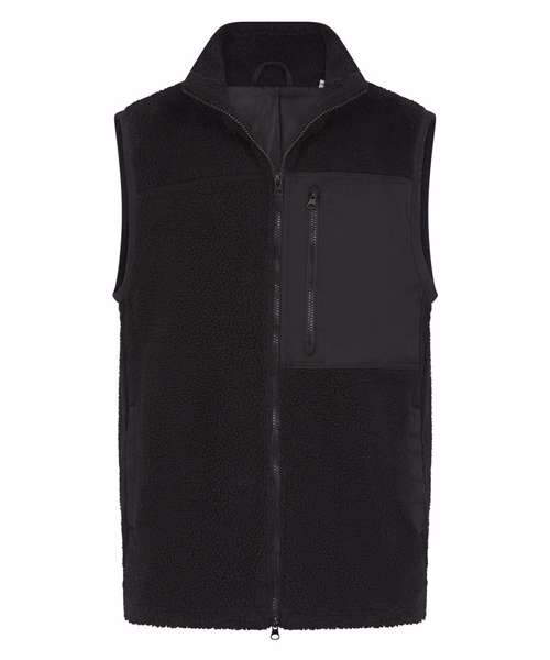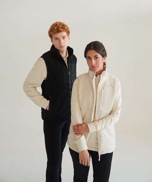 Zip-through recycled sherpa fleece gilet, regular fit. Lined with embroidery access. Contrast funnel collar, fleece inner. Flatlock stitched contrast panels – polyester/cotton twill. Front chest pocket with zip. Welt side pockets with popper fastening. Elasticated cuffs. Curved hem with elasticated cord. Tag-free for easy rebranding.