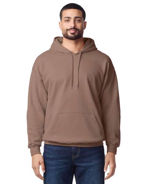 Made with our soft ringspun cotton blend, the Softstyle™ midweight fleece adult hoodie features a cosy, brushed interior with a 100% cotton face, ideal for DTG printing.Two-end ringspun cotton face fleece. Two-piece, colour-matched, Jersey fabric-lined hood. Dropped shoulder. Pouch pocket. 1x1 rib with Spandex cuffs and bottom band for enhanced stretch and recovery. Classic fit, tubular body. High-performing black tear-away label.