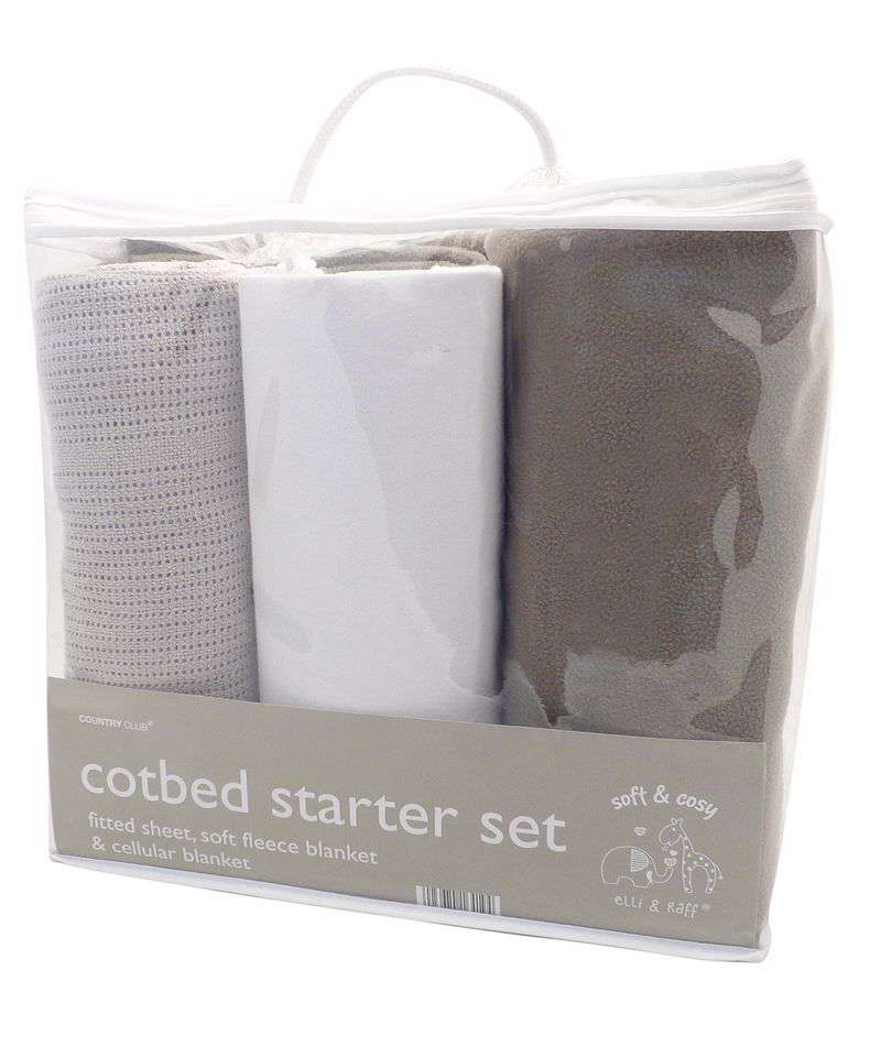 Soft and cosy 3-piece cot bed starter set, containing cellular blanket, soft fleece blanket and fitted sheet.