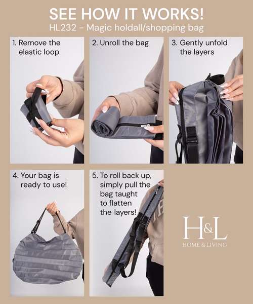 This magic duffle-style bag is compact, lightweight, durable and rolls neatly away when not in use. Ideal for shopping and days out, it features two adjustable handles, a full-length zip and has a spacious 30-litre capacity.