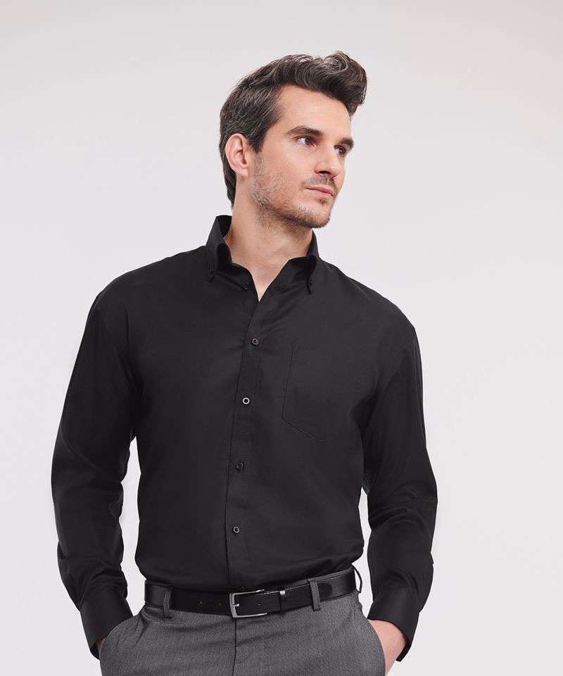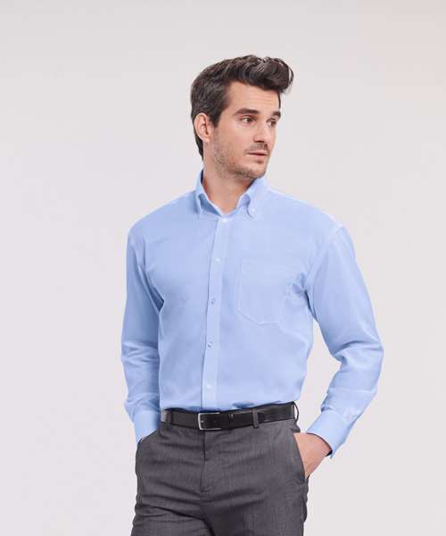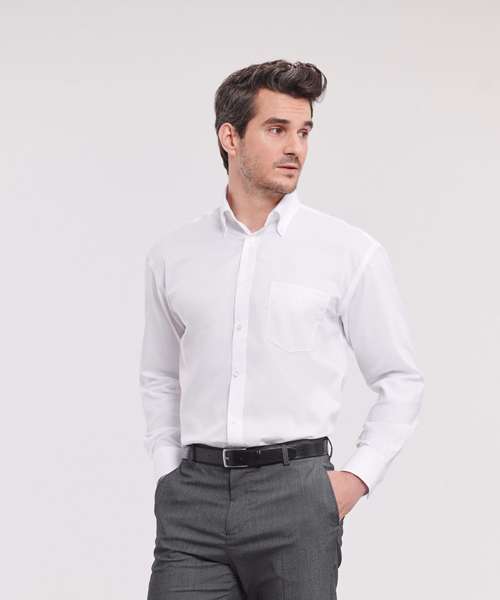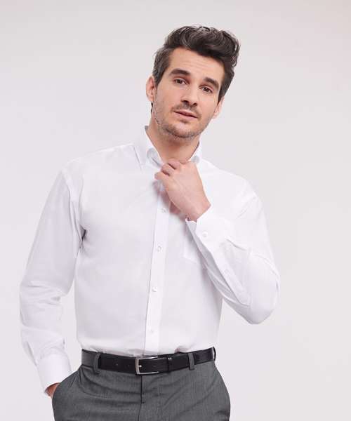 Made using the newest technologies of non-iron fabric that stays wrinkle free and keeps the wearer looking and feeling smart all day long. The classic gents shirt cut with semi-cut away button down collar and chest pocket. Contemporary size mitred cuff, adjustable with two buttons and with option for cuff links. Back yoke with two pleats. Rounded hem.