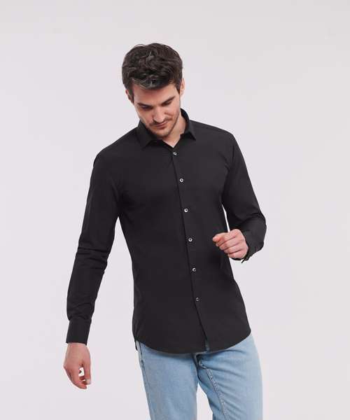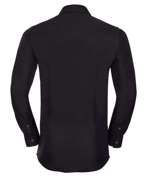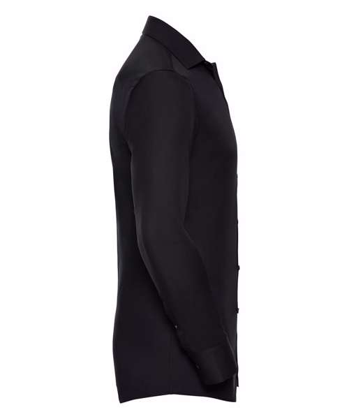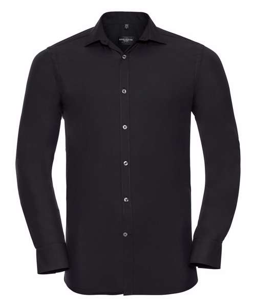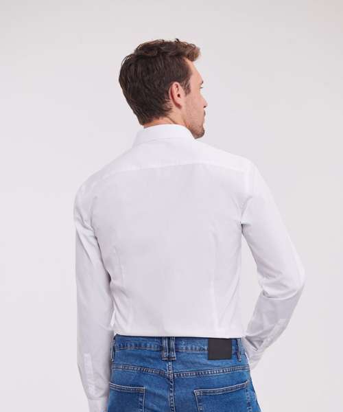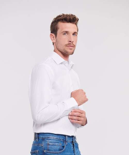 A unique and subtle comfort stretch from this advanced Elastomultiester Lycra® T400® fibre fabric creating a premium shirt that stays looking crisp and sharp all day long. Excellent shape retention for a lasting fit. Moisture management for cool comfort. Durable fabric. Fitted fit. Short leaf, semi cutaway collar. Narrow placket. Darts at back. Square edged cuffs. Cuff link options.