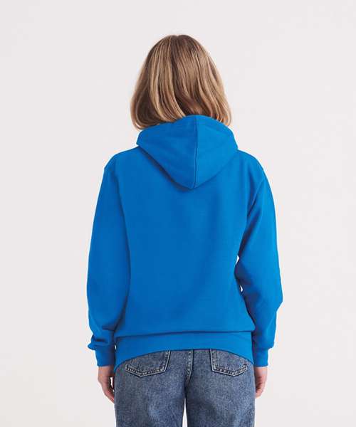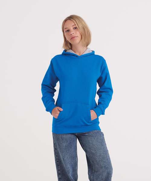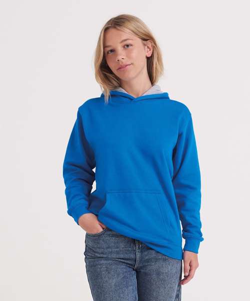 Twin needle stitching detail, double contrast hood with contrast inner. Kangaroo pouch pocket. Ribbed cuff and hem. Soft cotton faced fabric creates ideal printing surface. Brushed inner fleece.