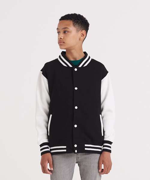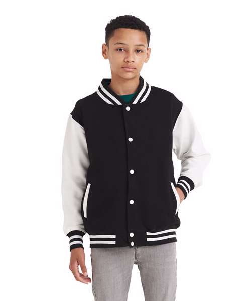 This kids varsity jacket is made in a sporty American style. It features a classic fit with contrast sleeves with excellent front popper fastening.