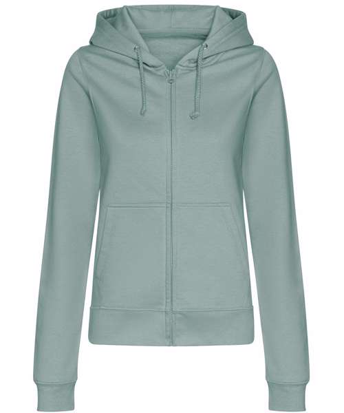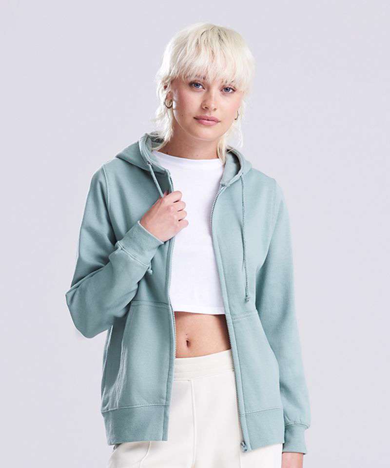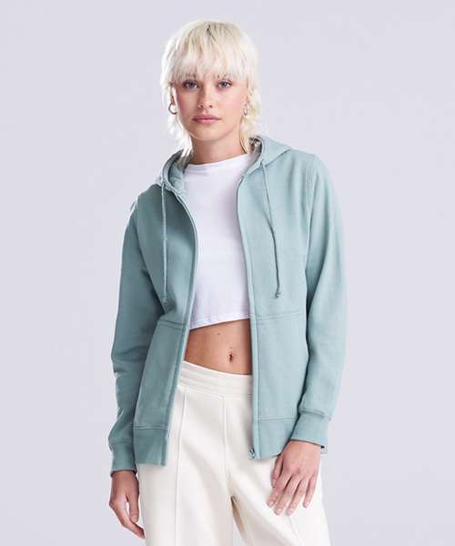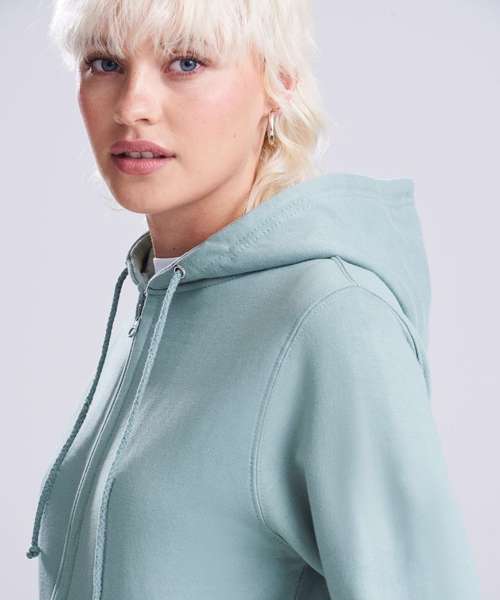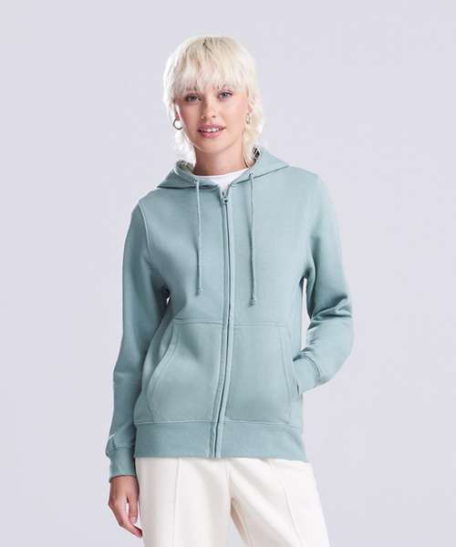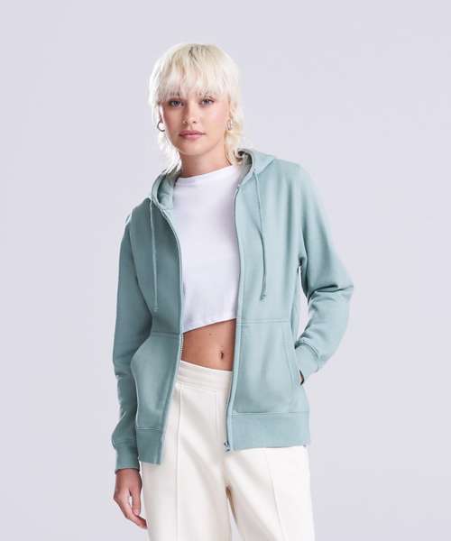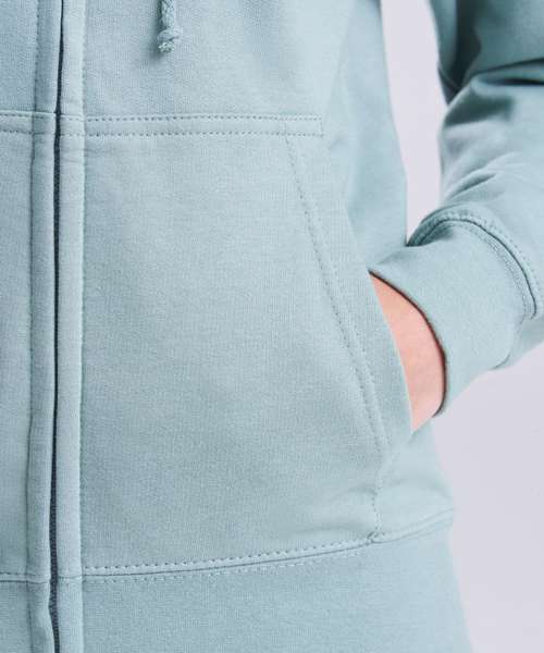 Full-zip zoodie. Women’s relaxed fit. Covered main plastic YKK zip. Twin-needle stitching detail. Double-fabric hood. Self-coloured drawcords. Kangaroo pouch pockets. Simple tear-out label makes it perfect for rebranding. Brushed inner fleece. Ribbed cuffs and hem. Soft cotton-faced fabric creates the ideal printing surface.