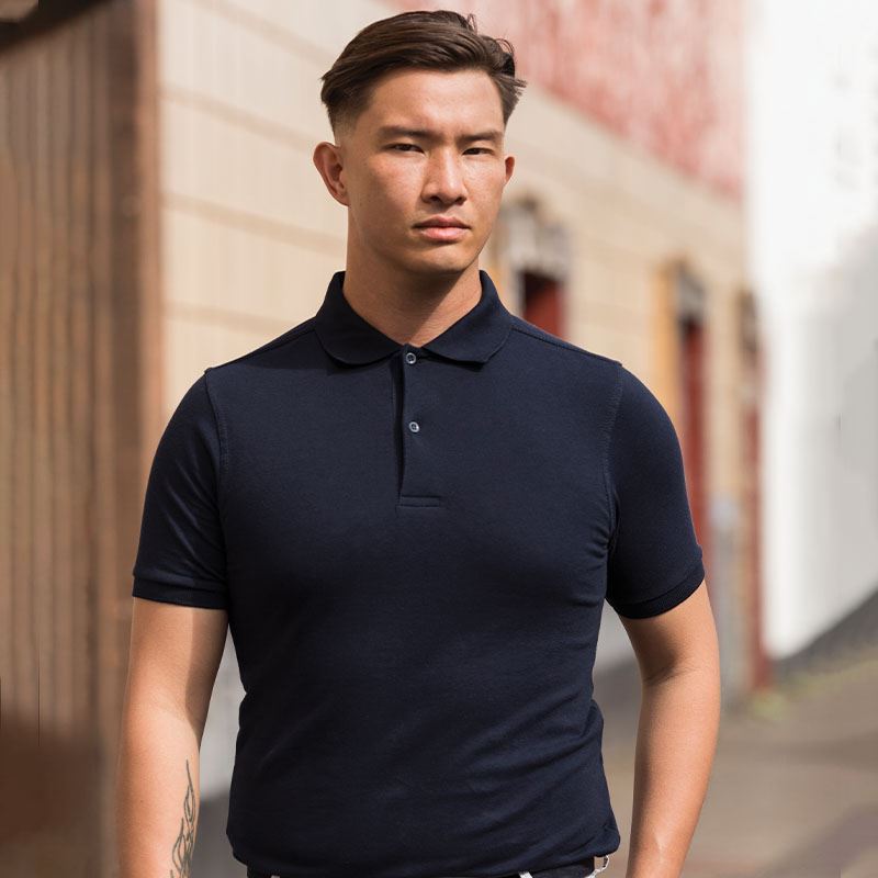 Update your collection with this classic polo, crafted from cotton and elastane fabric and featuring two-button placket (plus one spare) with short cuffed sleeves and side vents. With twin-needle stitching on the sleeves and bottom hem, the stretch polo is the perfect blank canvas for print or embroidery.