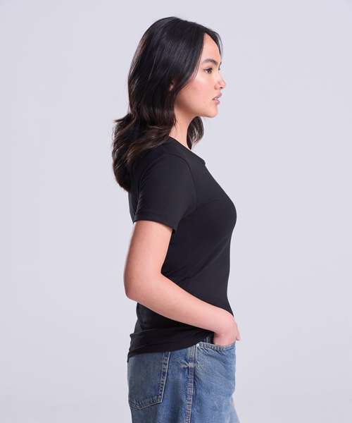 Girlie fit short sleeved T. Size tab label. Triblend fabric for style and comfort. Taped neck. Twin-needle stitching on sleeves and bottom hem. Ribbed crew neck style. soft-feel fabric. Side seams. Set-in sleeves.