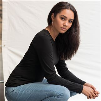 Girlie fit long sleeved T. Size tab label. Triblend fabric for style and comfort. Taped neck. Twin-needle stitching on sleeves and bottom hem. Ribbed crew neck style. soft-feel fabric. Side seams. Set-in sleeves.