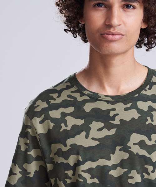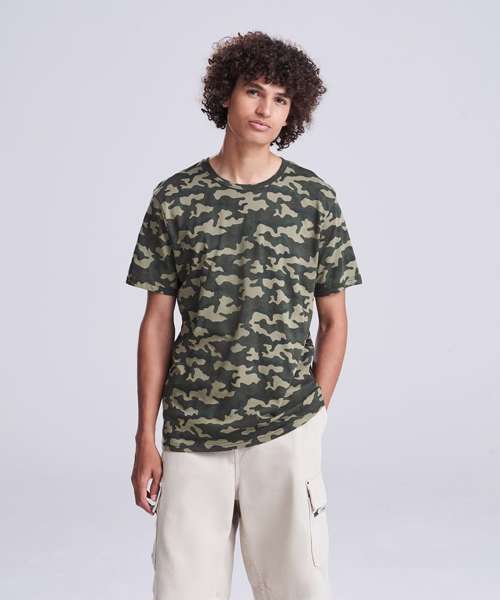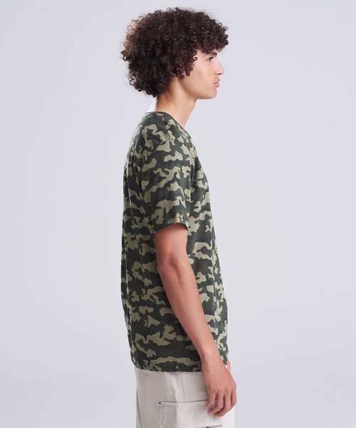 Modern fit short sleeved T. Size tab label. All over camo print. Taped neck. Twin-needle stitching on sleeves and bottom hem. Ribbed crew neck style. Side seams. Set-in sleeves.