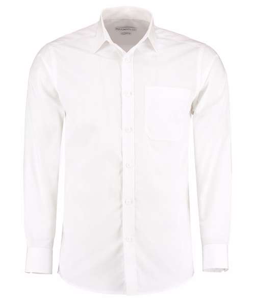 Fused semi cutaway collar. 7-button placket with self-coloured buttons. Rounded hem. back yoke. Single stitching around armholes. Double-stitched sleeves and side seams. Adjustable 1-button cuff with pointed no button cuff placket. Patch pocket with angled corners to left chest as worn. Spare button. Kustom Kit® woven back neck label.