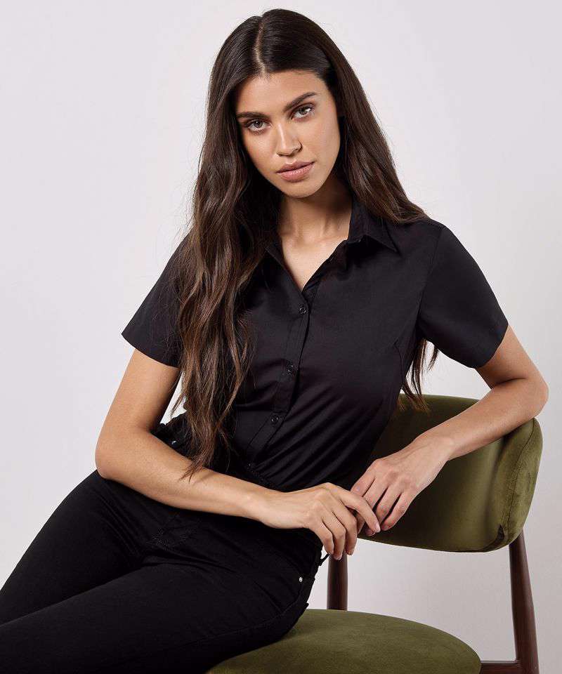 Women's short sleeve tailored poplin shirt. Versatile contemporary styled business shirt with soft collar.