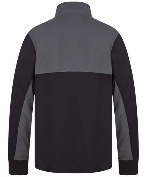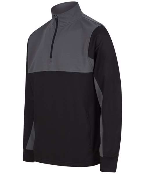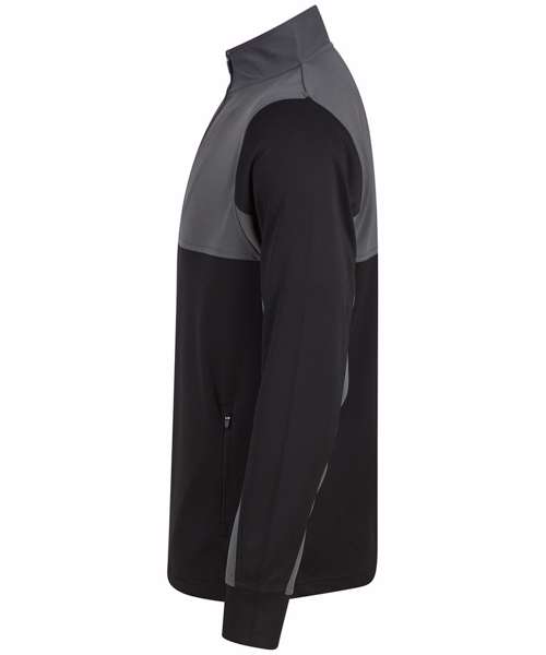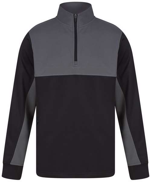 Contrast upper chest and underarm panels. Quarter zip. Side panels. Reverse nylon zips centre front and side pockets. 1x1 ribbed cuff sleeve. Semi-automatic zip pull and slider.