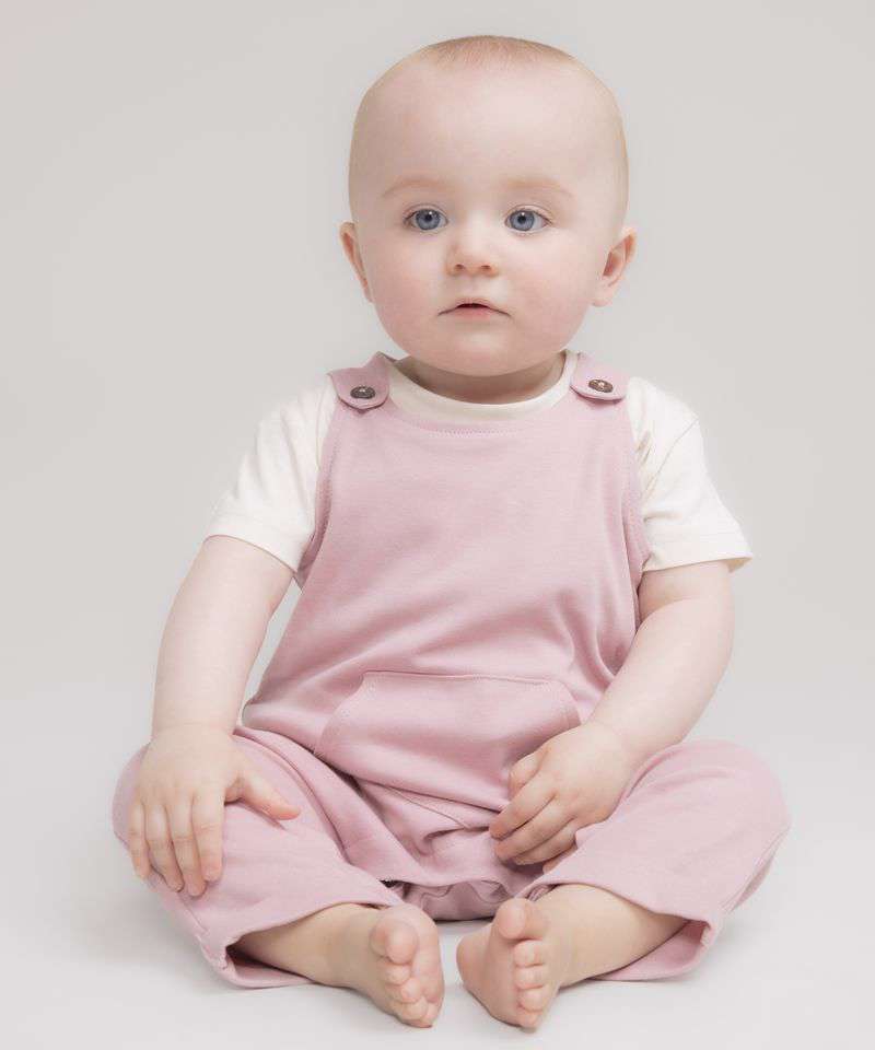 Cotton dungarees made in sustainable fabric with horn-button shoulder fastening. Central kangaroo pocket. Rolled and stitched leg hems with integral poppers around the inseam. Single Jersey facing. Tag-free.