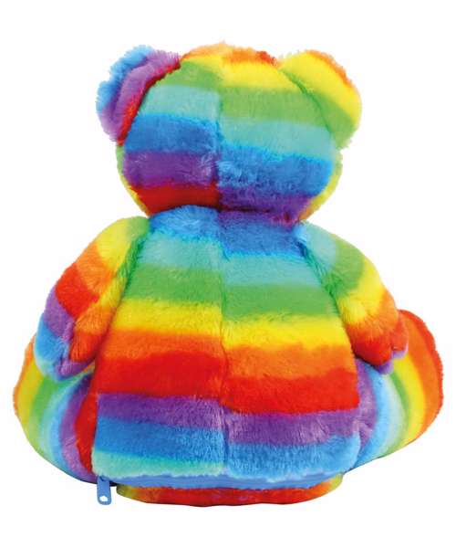 The multi-coloured soft plush bear has endearing contrast sewn nose and eyes with cream coloured panel on tummy and feet. Perfect for embroidery and sublimation printing with zip access at base.