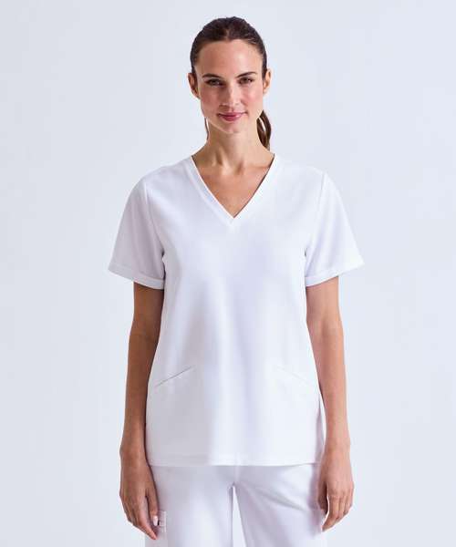 Women’s short sleeve scrub tunic. Comfortable four-way stretch. Breathable, easycare, crease-resistant fabric. V-neck, turn-up sleeves and two front pockets. Back darts, side vents and modern fit. Decorate with embroidery and/or print. Contains certified recycled polyester.
