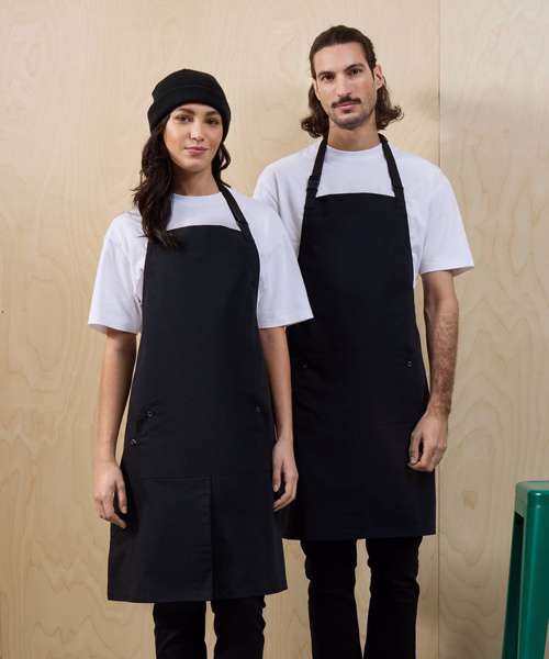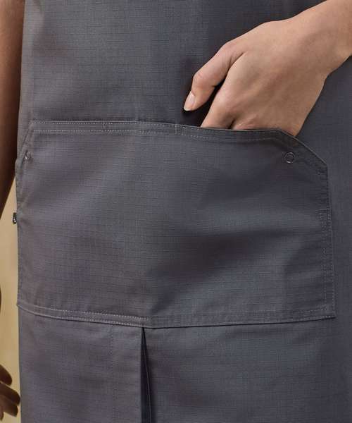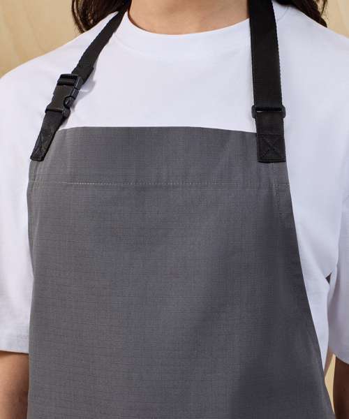 Full bib apron with woven ripstop fabric for strength and durability. Adjustable seatbelt-style neck strap with a clip fastening buckle. Seabelt-style waist ties. Centre pocket with press stud buttons to release extra pocket space. Fabric tab off the centre pocket. Centre split for ease of movement. 86cm long x 72cm wide. 90cm straps. Contains certified recycled polyester. Washable to 60°C.