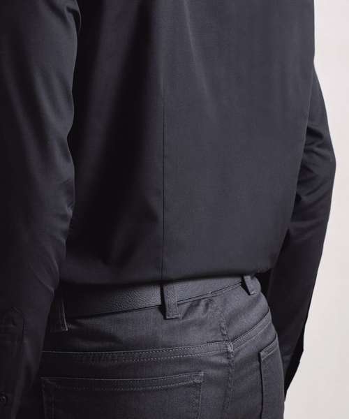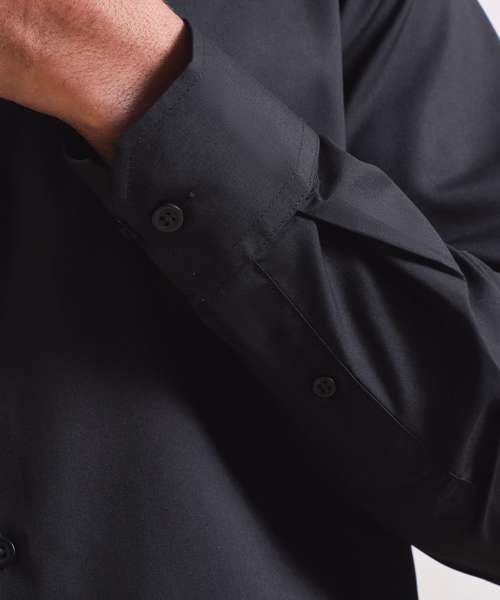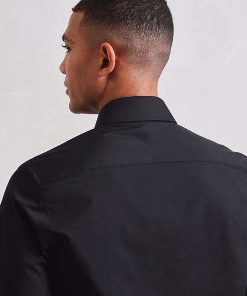 Men’s poplin shirt made with certified recycled polyester and cotton. Stiffened formal collar with top button. Full button-through with pearlised buttons on white and self-coloured on black. Two-button adjustable cuff with cufflink hole. Sleeve guard with single button. Curved hemline. Back darts and yoke for overall fit and shape. Easycare fabric.