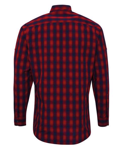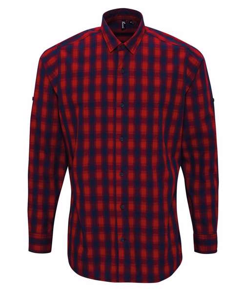 Long sleeve semi-fitted shirt for men with a multi-coloured contrast check pattern. Single button cuff and sleeve guard which is designed to be rolled up and secured in place with a button and tab on the upper arm. Soft collar styling with curved hem.