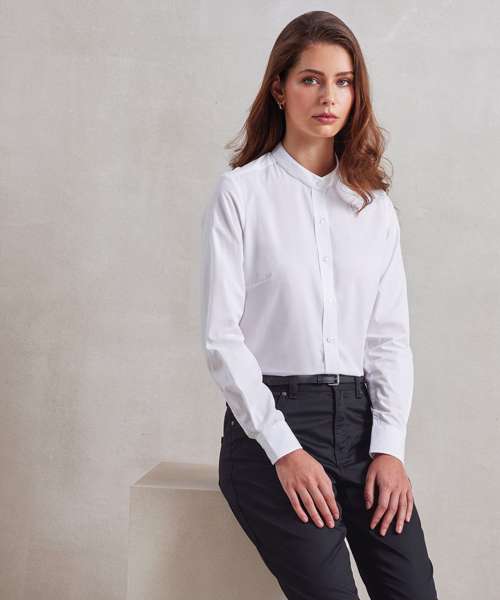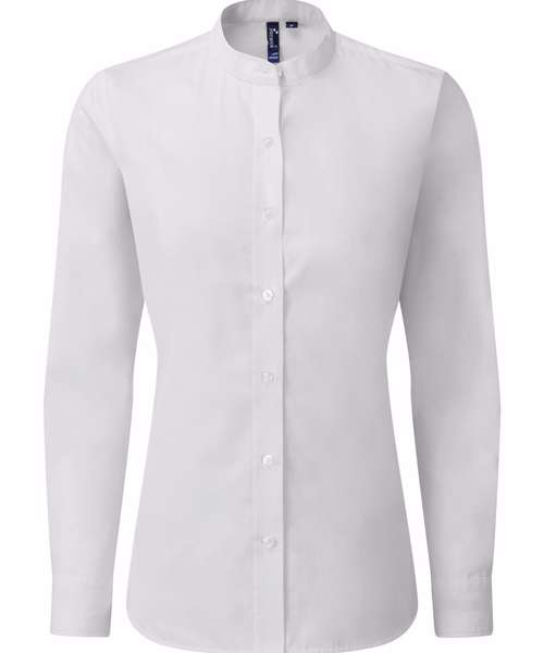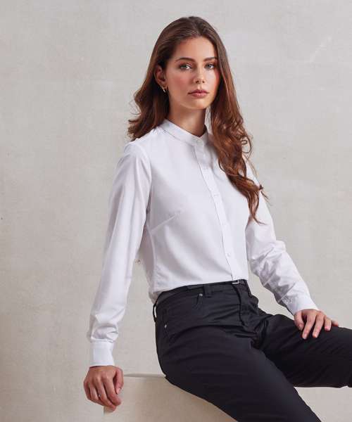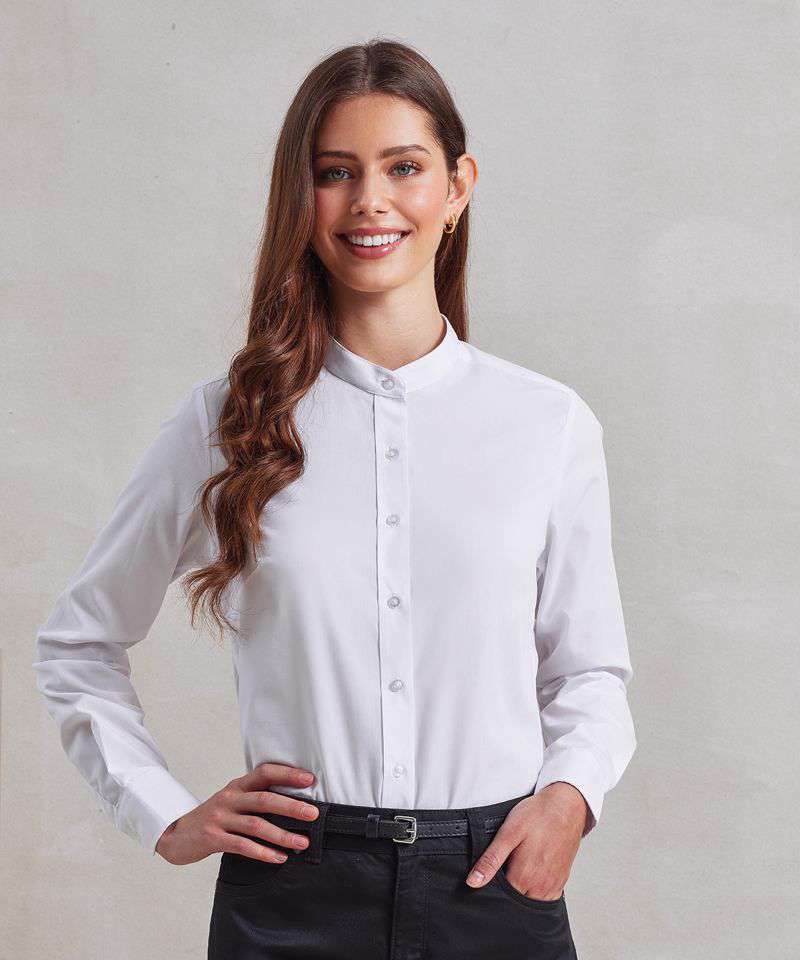 This iconic shirt is a welcome addition to our hospitalitywear collection and is a popular style for wearing front-of-house. The distinctive collar features a narrow banded fabric strip that runs around the neck and fastens at the front with a top button. Double buttons to the cuff and a sleeve guard allow for a more casual rollback option on the arm. Styled with bust and back darts and a curved hem for a flattering feminine fit.