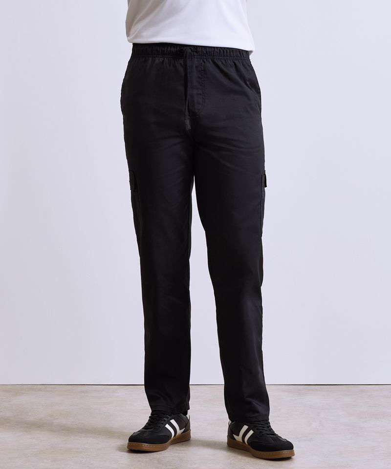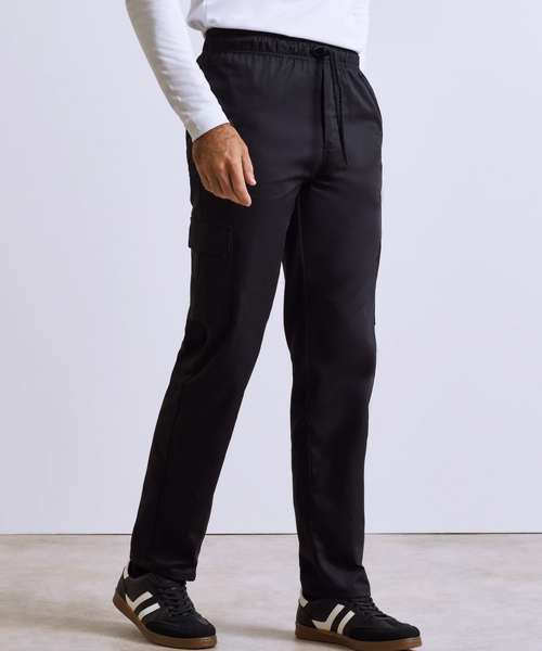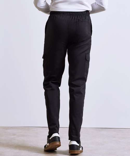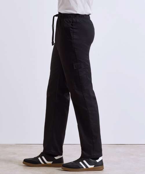 These chef's trousers are designed with classic cargo style pockets on both legs that are deep enough to hold a mobile device. Tear release fastening for security. The waistband is elasticated for comfort with a drawcord for adjustment. There is handy rear patch pocket with tear release fastening.