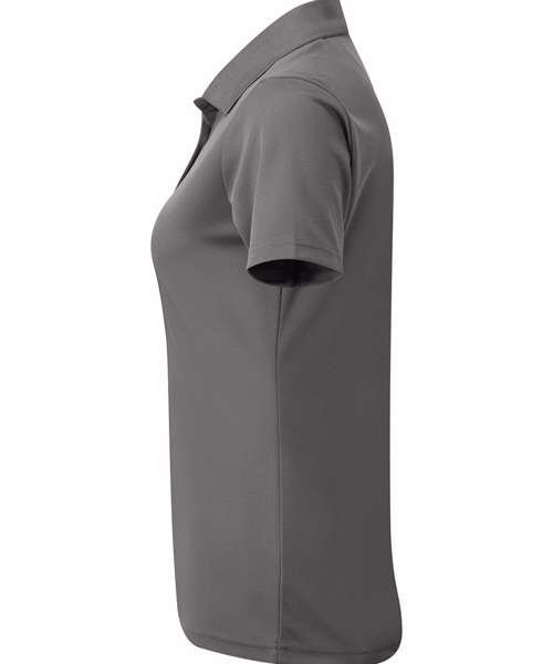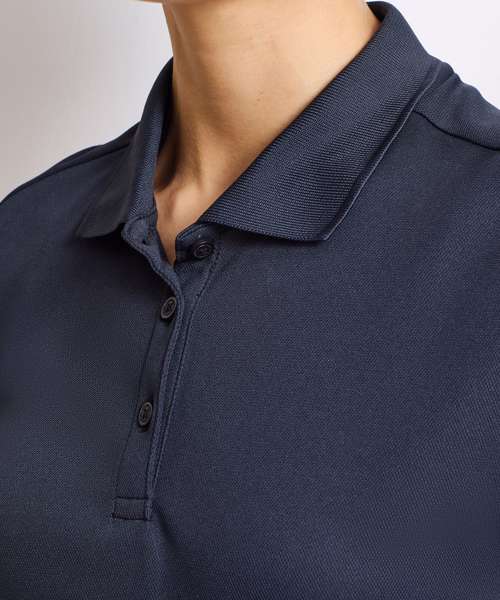 Women’s short sleeve polo shirt made from certified recycled polyester with a production method that has a reduced environmental impact for creating spun dyed yarns. Moisture management properties to the fabric guarantee a breathable and wicking performance, so the wearer stays fresh and cool. Styled with a ribbed collar, three-button placket and side vents.