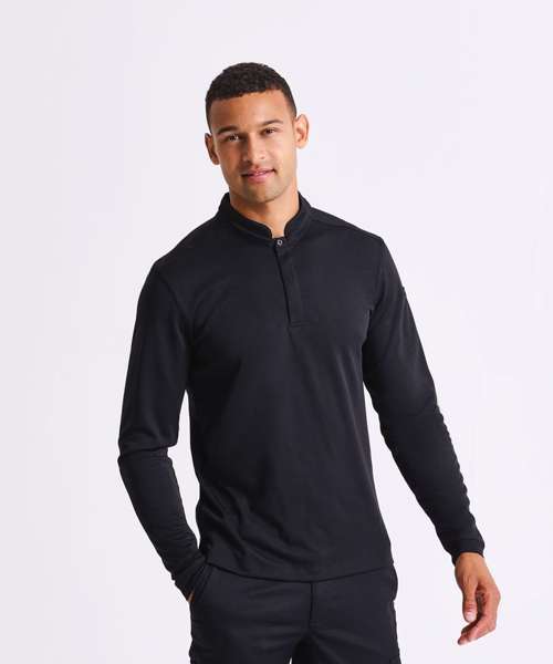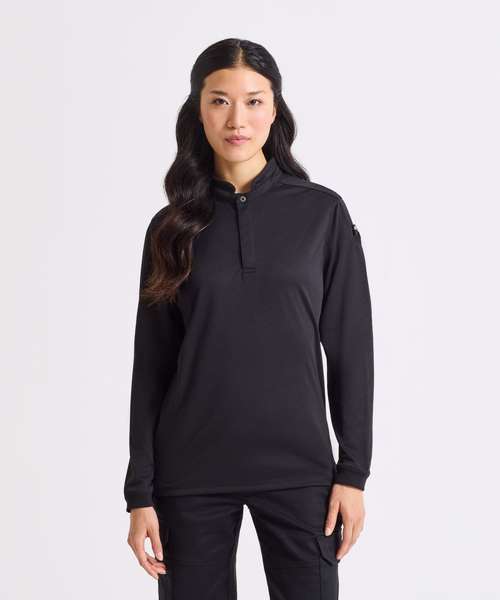 Long sleeve shirt in Premier’s moisture-wicking, breathable Coolchecker® fabric. Mesh back panel provides ventilation and airflow. Banded neckband with single press-stud button. Mandarin collar stand. Covered placket with two press-stud buttons. Press-stud button to the reverse to hold an apron in place on the neckband. Pen pocket on the upper left sleeve. Ribbed-knit cuff for a neat finish on the wrist. Slide slits on the hemline. Made with 100% certified recycled polyester.