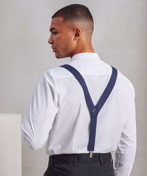 Y back trouser braces with stretchy elastic fabric for comfort and style. 3cm strap width. Two metal non slip clips to the front for attachment to trousers. One clip to the back. Metal lock buckles for adjustment making a one-size-fits-all piece.