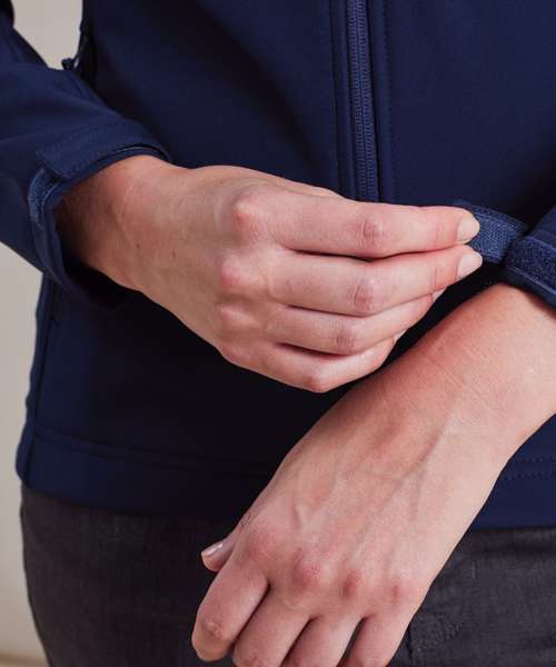 Two-layer softshell jacket with a bonded fleece inner, featuring two handy patch pockets. Full zip-through style with zip pulls. Cadet collar with chin guard. Zipped side pockets with zip pulls. Hook and loop strip on cuffs for adjustable fastening. Curved hemline with an elastic drawcord and plastic cord lock to secure in place. Stitched side panels enhance this more feminine fit. Made from 100% certified recycled polyester with Premier’s Windchecker® trademark for a wind- and water-resistant style that is suitable for screen print applications.