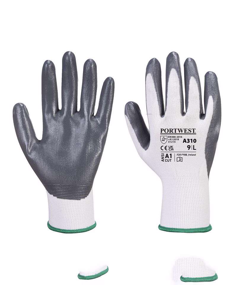 Conform to EN388:2016 (3.1.2.1.X) and EN420. Seamless 13 gauge nylon liner with nitrile coating on palm and fingers. Smooth finish. Enhanced abrasion resistance. Open back for extra ventilation. Knitted wrist. Excellent dexterity, ideal for handling of abrasive materials. Prevents grease, oil and water penetration. Applications: utilities, maintenance, refuse collection, warehousing.