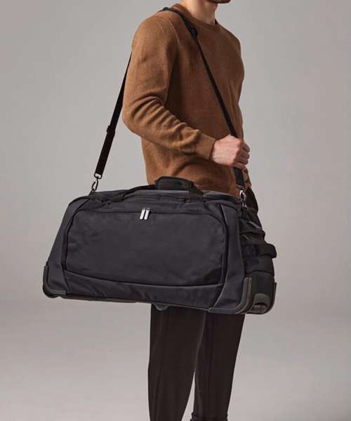 Zippered side pocket, multiple internal pockets. Detachable adjustable shoulder strap with pad. Haul handle. Padded hand grip. Retractable twin tube locking tow handle. Durable integrated skate wheels. Zippered front pocket. Padded handles. Covered name card holder.