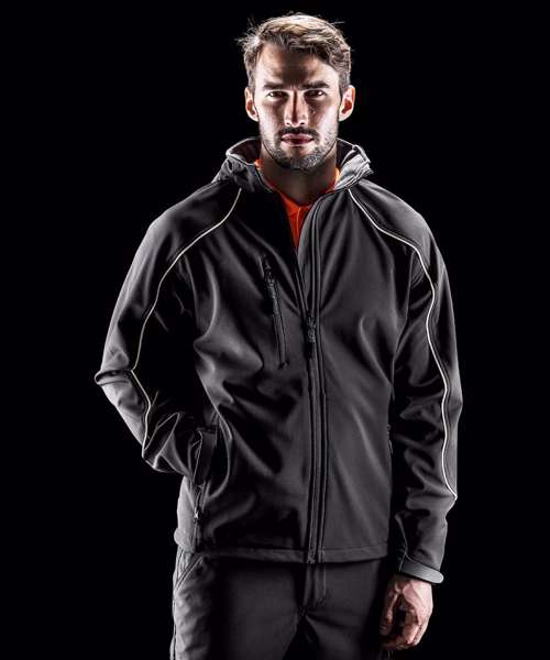 Water resistant seamless shoulders. Windproof. Result® 3 layer softshell technology. Breathable. Fully waterproof hood. Soft 2-way stretch fabric. Comfortable active cut. Concealed fully lined hood with tear release closing chin guard, wired visor and shockcord adjusters. YKK full front zip fastening. 2 mesh lined zip closing side pockets for extra venting, 1 mesh lined zip closing chest pocket for extra venting, 2 large inside pockets and 1 inside phone pocket. Easy open zip pullers. Adjustable shockcord hem. Tear release adjustable cuffs. Inner storm flap. 3M™ reflective safety piping to shoulders and sleeves. Zip opening underarm vents with mesh cover. Concealed access for print and embroidery. Waterproof fabric.Decoration Guidelines:Decorating methods: Embroidery. Decorators access point: Concealed left chest zip.