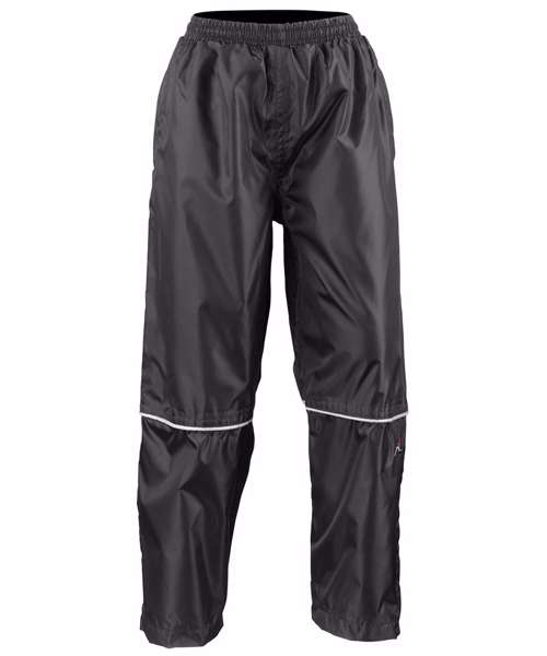 Ripstop waterproof (2000mm). Windproof. Cut for enhanced freedom of movement. Lower leg zip opening for easy access without removing shoes. 2 zip closing side pockets and 1 zip closing back pocket. Adjustable drawcord and elasticated waist. Reflective piping to lower leg incorporating reflective materials. Embroidered ResultĀ® sport logo to lower left leg. Fully taped waterproof seams. Concealed access for print and embroidery.Decoration Guidelines:Decorating methods: Embroidery, Direct print & Transfer print. Decorators access point: Open.