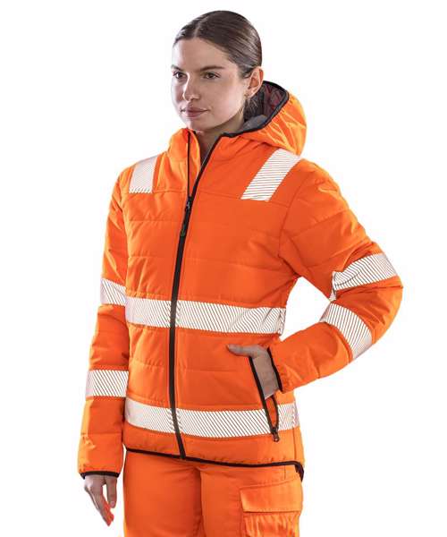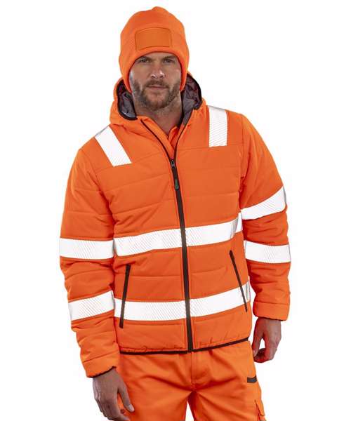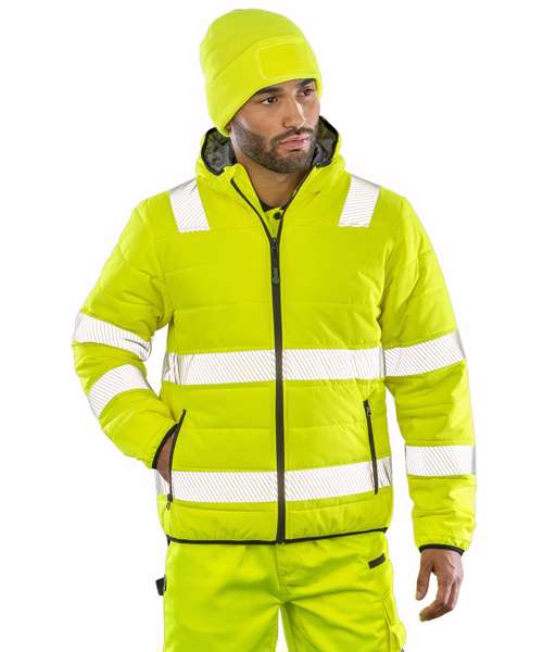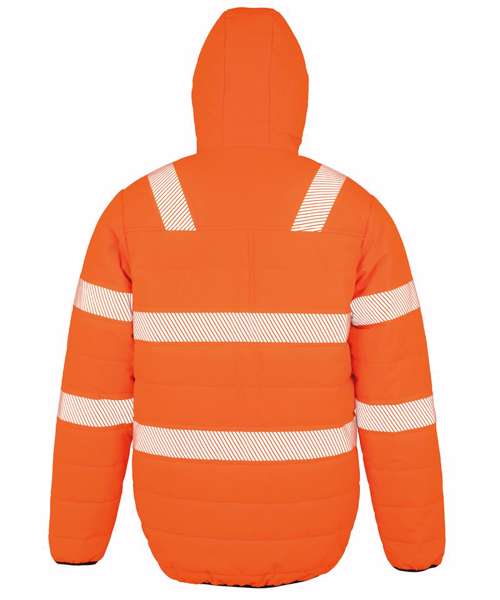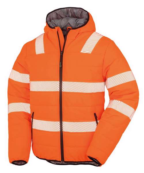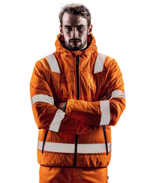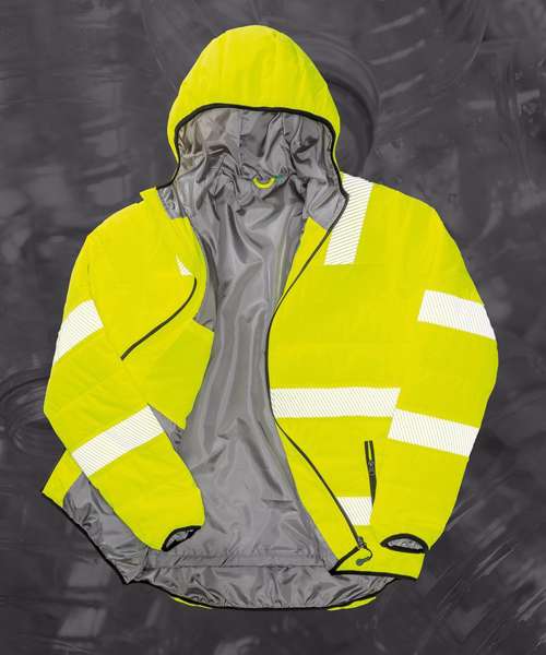 Tough, warm and recycled: a padded printable, hooded safety jacket in water-repellent finish.
