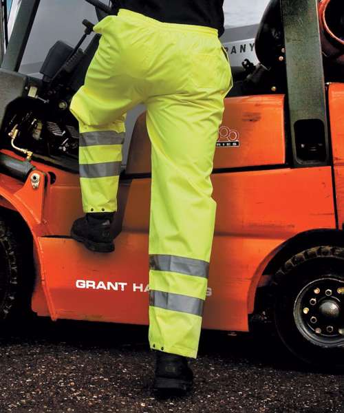 Waterproof 3000mm, windproof. Taped seams, no outside leg seam. 2 side access pockets and 1 back key pocket. Elasticated waist with drawcord adjuster. Stud closing ankle adjusters. 50mm reflective leg bands. Cutaway label. EN ISO 20471 + A1:2016 CLASS 1. RIS-3279-TOM ISSUE 2:2019 CLASS 1 (orange only*). *Orange only meets RIS 3279 Tom: Issue 2:2019 when worn with unobscured class 2 upper body clothing. Note: These garments should be worn fastened and kept clean to maintain effectiveness. Oeko-Tex certified. Decorating methods: Embroidery, transfer and print.