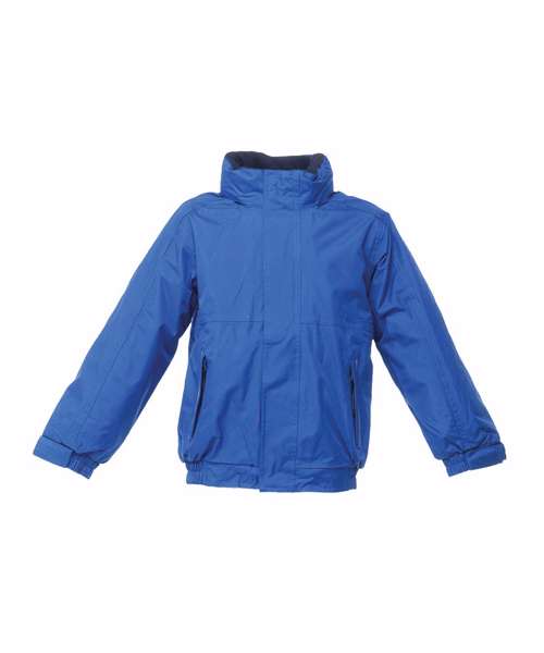 Windproof with taped seams and studded and hook and loop fastening stormflaps with concealed hood and fleece lined collar. Elasticated cuffs and 2 zipped lower pockets and an inner pocket. Printed name label inside with a concealed zip entrance in lining for embroidery access.